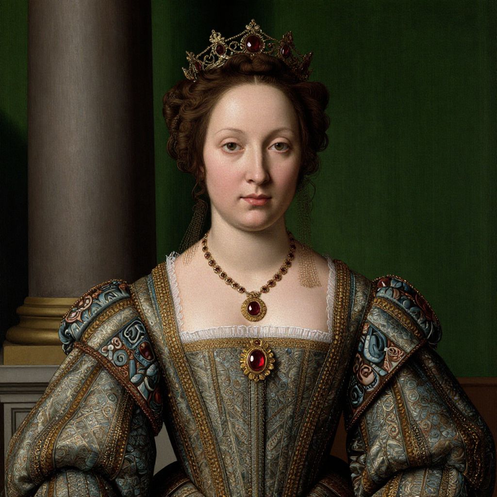 Photorealistic portrait of a pale-skinned, young woman in ornate Renaissance attire, wearing a silver crown, pearl necklace, and brooch,