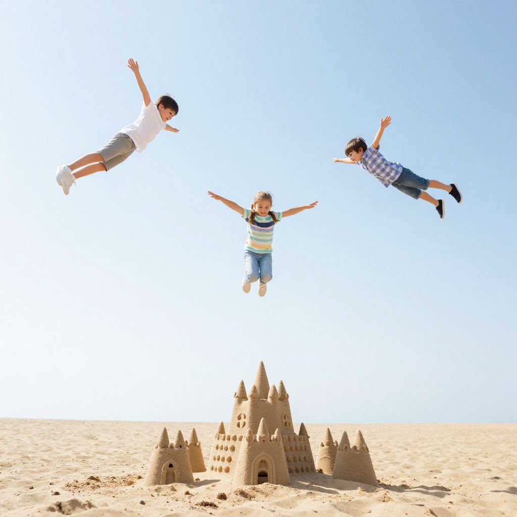 Photograph of a young girl with light brown hair, wearing a white sleeveless top and light blue skirt, jumping against a bright blue sky, reaching