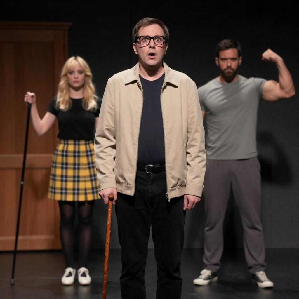 Photograph of a dark stage. Blonde woman on all fours, wearing a beige dress, facing a standing man with dark hair, wearing a leather jacket and jeans. Checkered floor, spotlight on man, dim lighting. Man's expression neutral. Woman's back to camera.