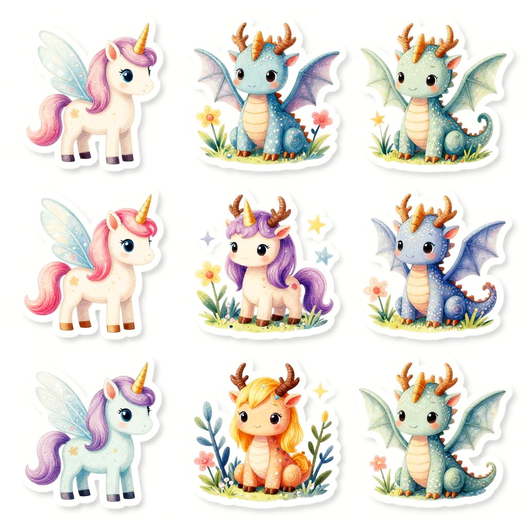 Cute stickers printable depicting fantasy creatures like tiny unicorns, dragons, and fairies in a magical forest setting, illustrated with pastel hues and intricate details, suitable for children’s stationery, gift wrapping, and imaginative storytelling.