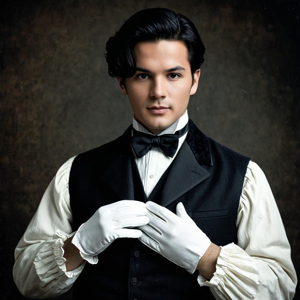 Period costume man ,1boy, male focus, solo, realistic, vest, white shirt, long sleeves, shirt, pants, black hair, looking at viewer, ascot, closed mouth, red vest, standing, short hair