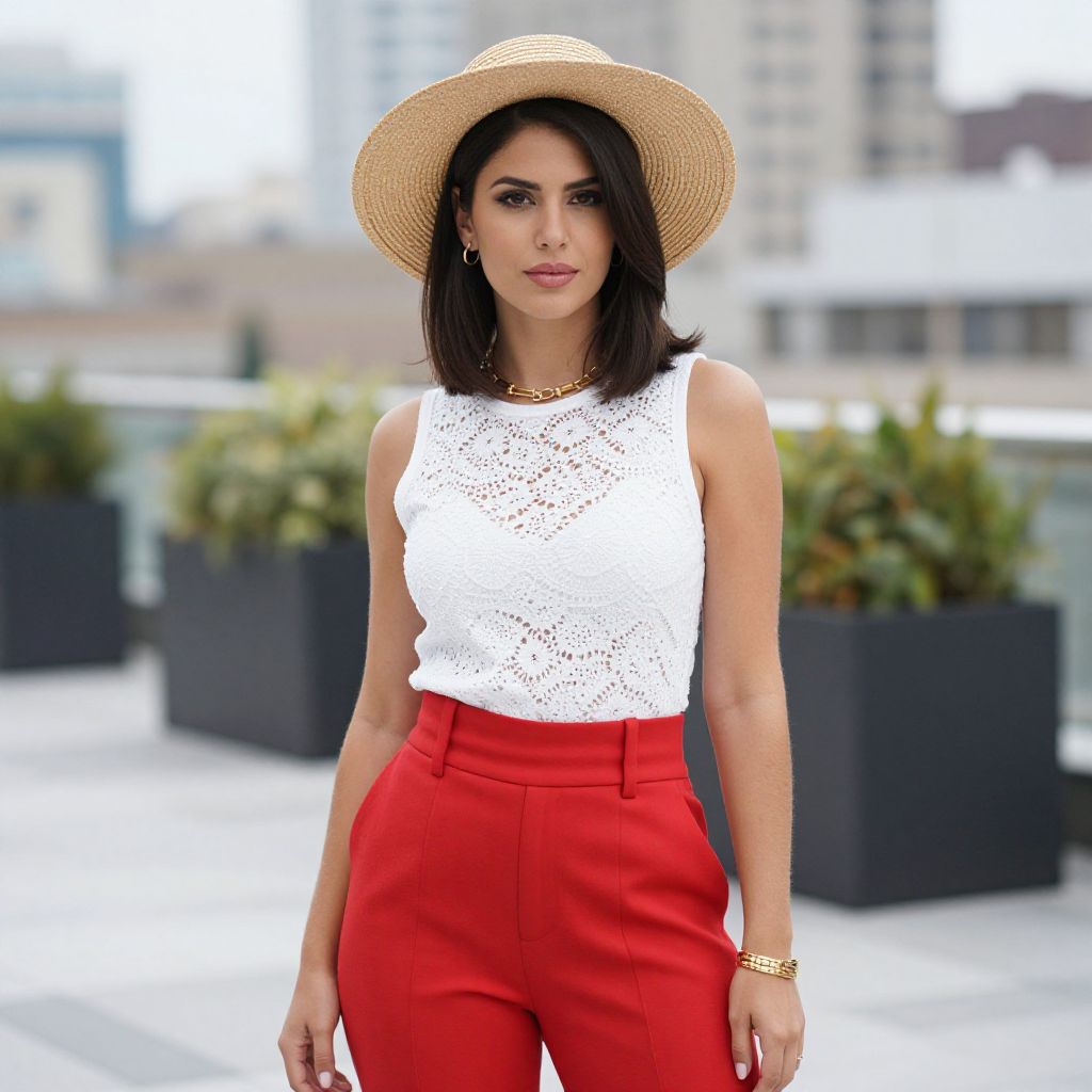 Photograph of a stylish woman standing on a rooftop. She has medium-length dark brown hair, wears a straw hat, white lace sleeveless top, and bright red high-waisted pants. She's accessorized with gold jewelry and a gold bracelet. The background shows an urban cityscape with blurred buildings and greenery in black planters. Her confident pose and subtle smile add a chic, summery vibe.