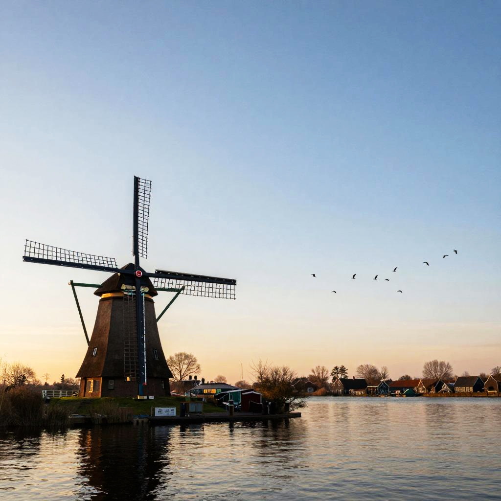Photograph of a traditional Dutch windmill by a calm canal at sunset, with a flock of birds flying overhead, and a clear blue sky.