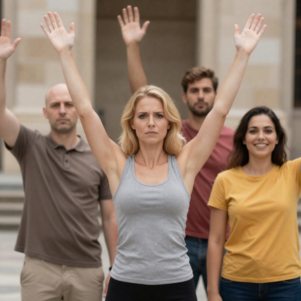 Close-up portrait of a blonde woman with a high ponytail, wearing a white sleeveless top stained with blood. The woman has an intense facial expression and outstretched arms. The background features a blue grid pattern, with blurred arms of two men holding hands in the foreground. The lighting is bright, highlighting the dramatic mood of the scene.