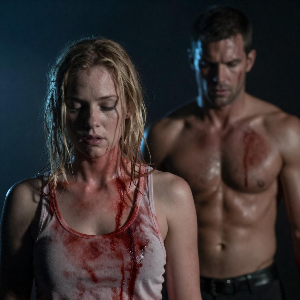 Intense Blonde Woman with Blood Stain in White Top