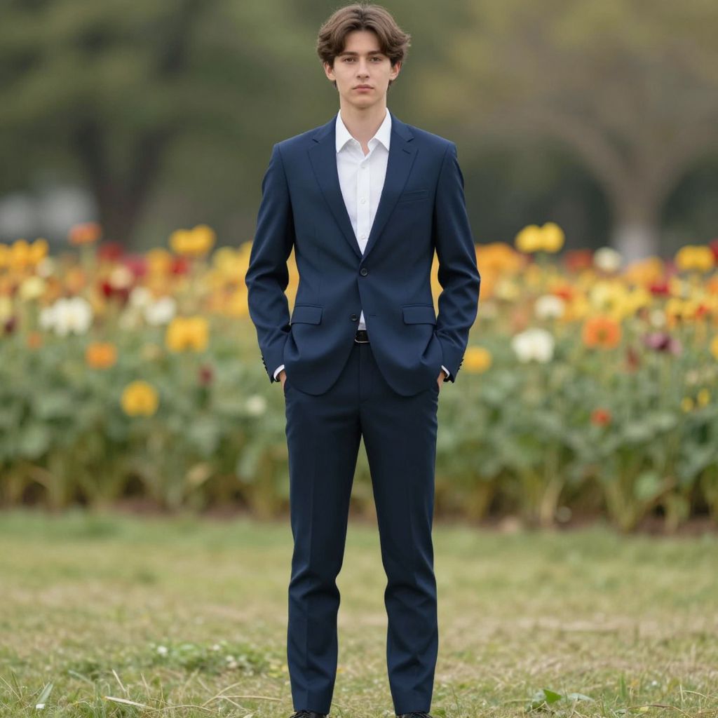 Photograph of a young Caucasian man with wavy brown hair, standing in a grassy garden. He wears a dark navy blue suit with a white dress shirt, his hands casually in his pockets. The background features a blurred field of vibrant yellow and orange flowers, with green foliage and trees in the distance. The man's expression is neutral, and the overall scene is bright and colorful, contrasting the formal attire with the natural garden setting.