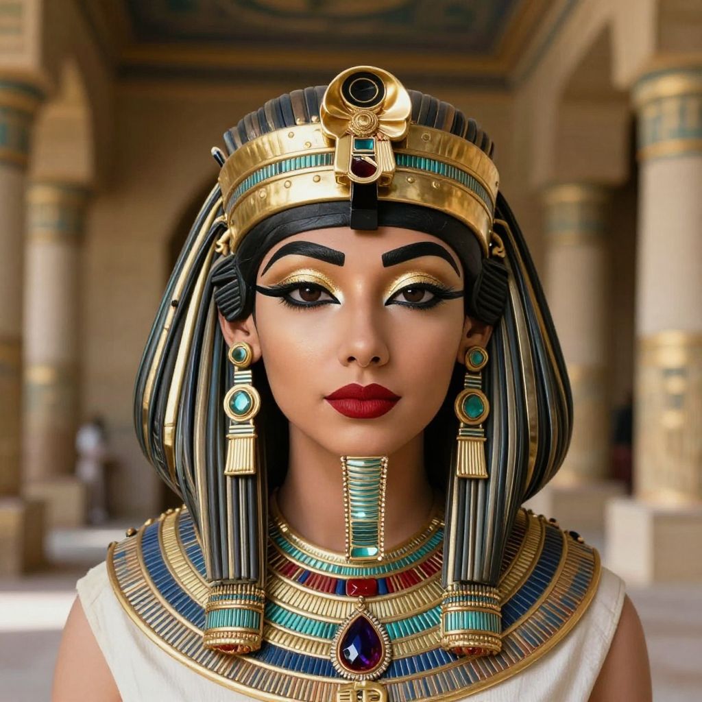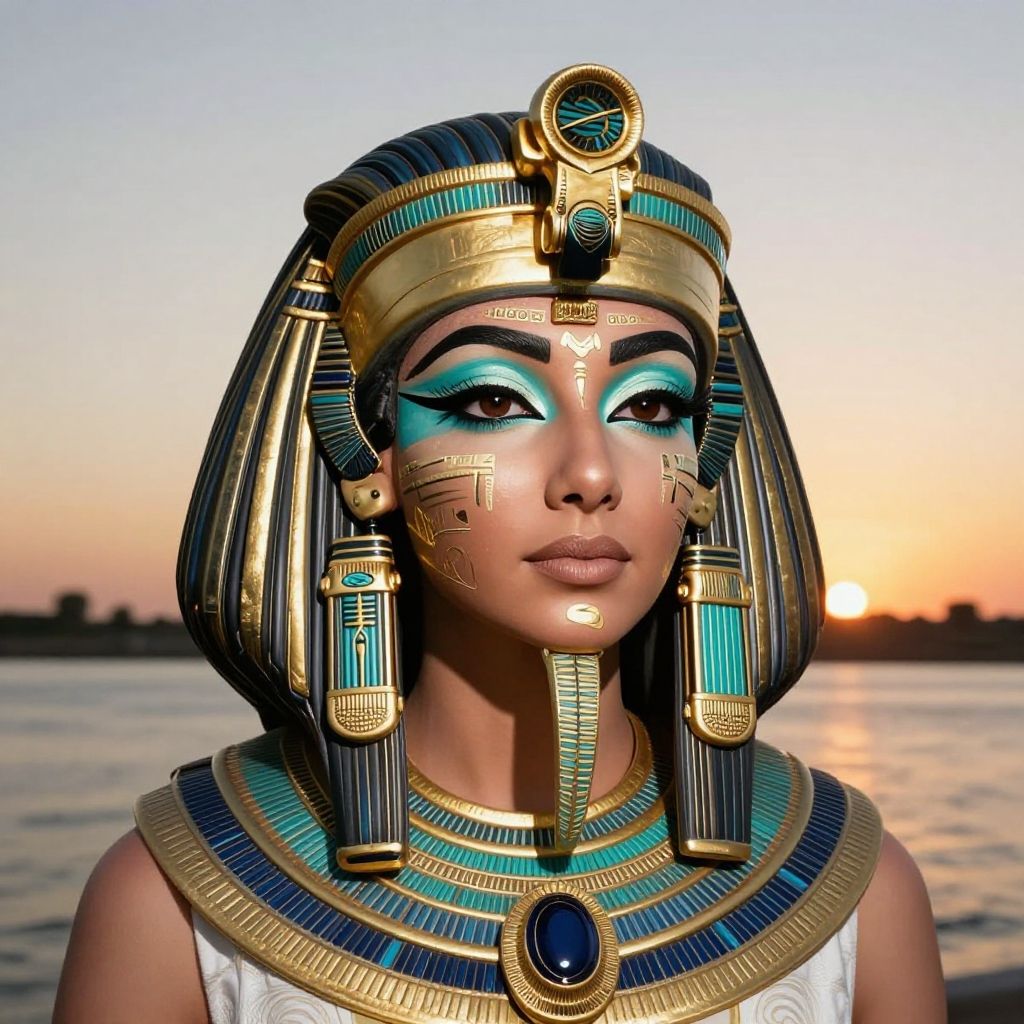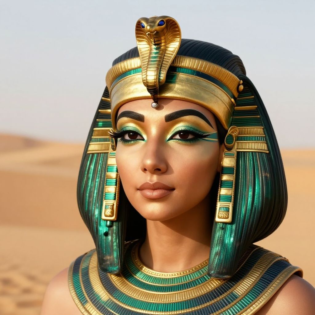 Digital artwork of an Egyptian woman with dark hair, red lips, gold headpiece, and jewelry, standing in front of pyramids.