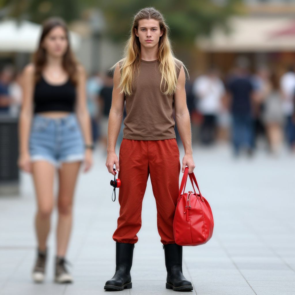 "fire hydrant costume treat, solo, bag, outdoors, long hair, blurry, pants, blonde hair, male focus, 1boy, full body, realistic, standing, brown hair, looking at viewer, blurry background, boots, 1girl Realistic photo of casual sexy person with pretty face"