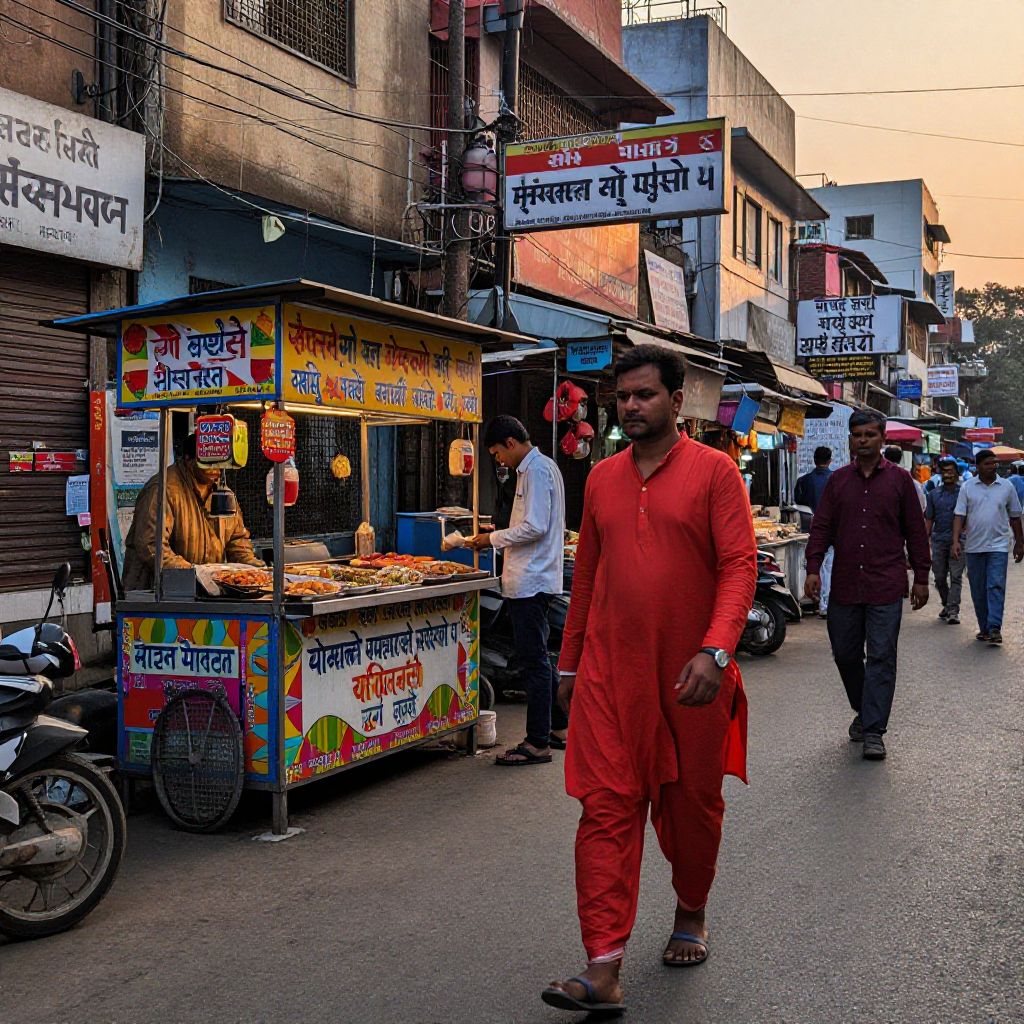 A modern street in Delhi at sunset, a man in a vibrant red dhoti walks past colorful markets, with local food stalls and hand-painted signs, blending traditional wear with contemporary urban life.