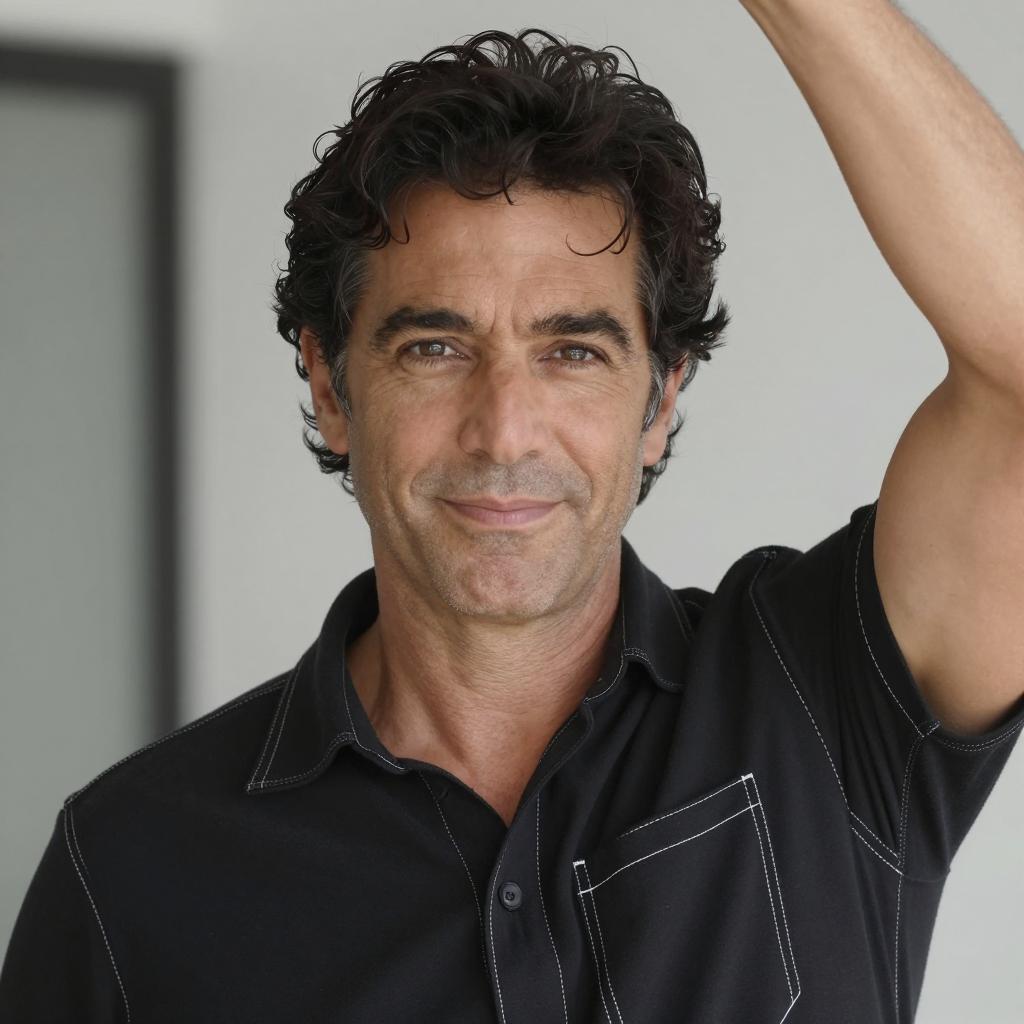 Middle-aged man with wavy dark hair, slight smile, wearing black short-sleeve shirt with white stitching, arm raised, blurred background.