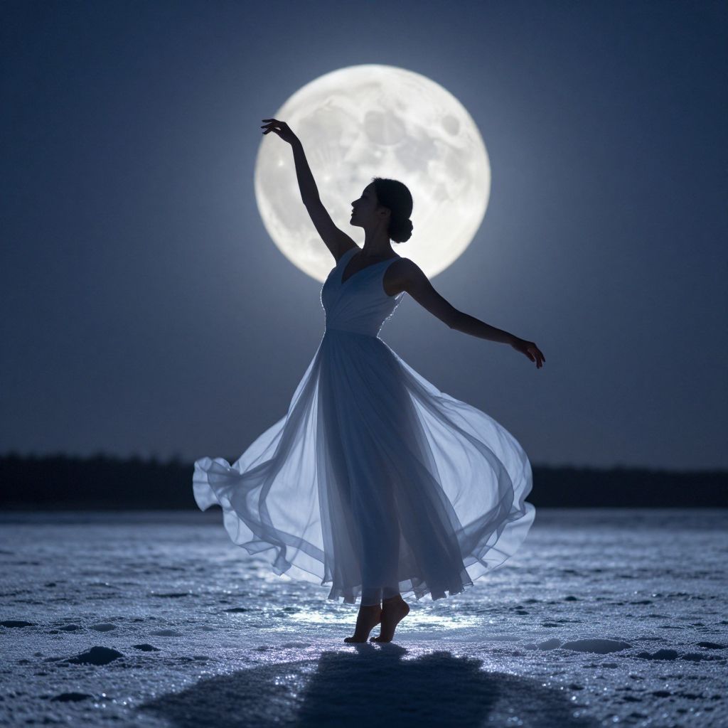 Silhouetted against a luminous full moon, a woman in a flowing white gown stands gracefully on a reflective, frost-covered landscape, her form bathed in ethereal moonlight.