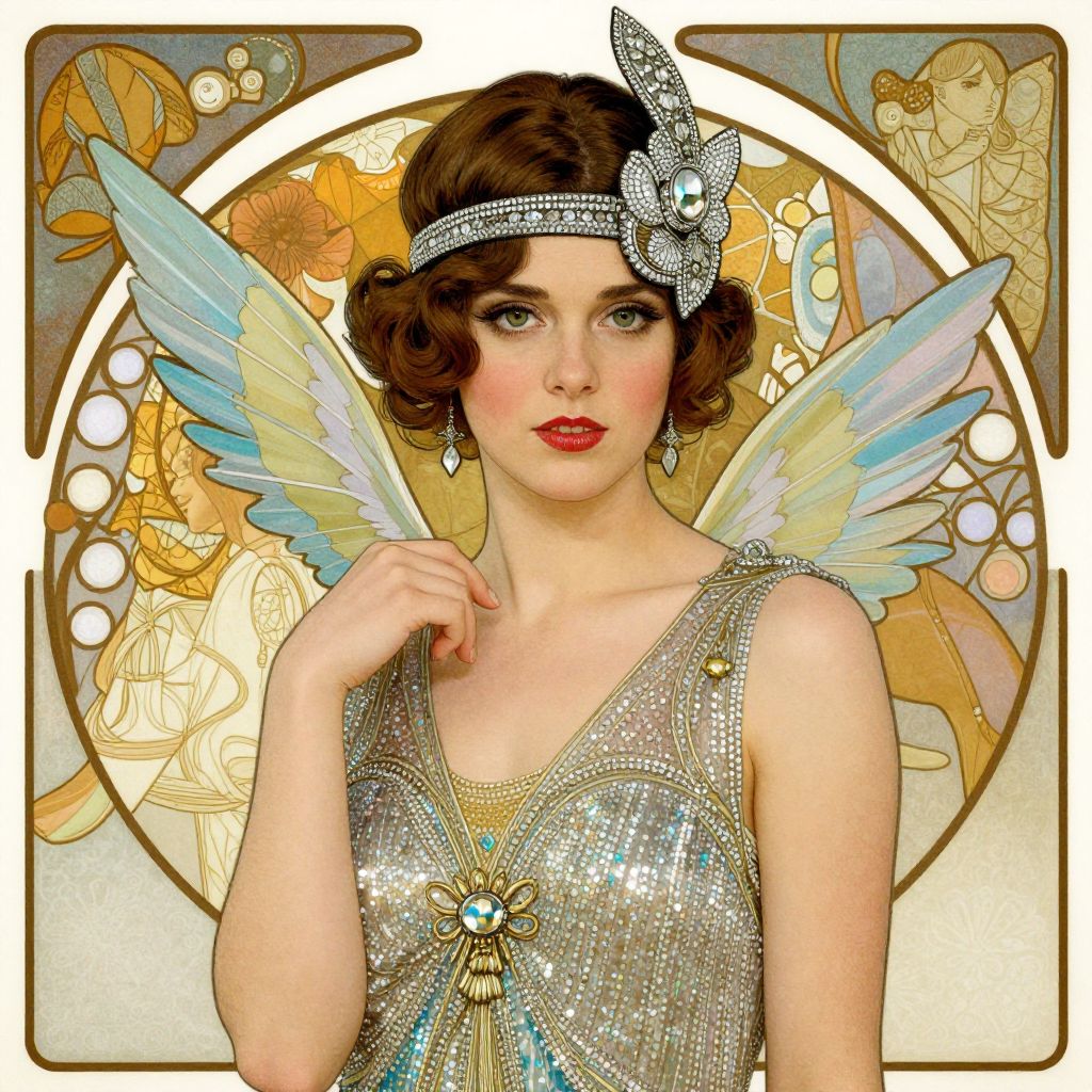 A stylized portrait of a young woman dressed as a flapper from the 1920s, wearing a sparkly dress and intricate headpiece, with a fantasy winged element, by artists such as Stanley Artgerm Lau, Greg Rutkowski, Thomas Kindkade, Alphonse Mucha, Loish, and Norman Rockwell.