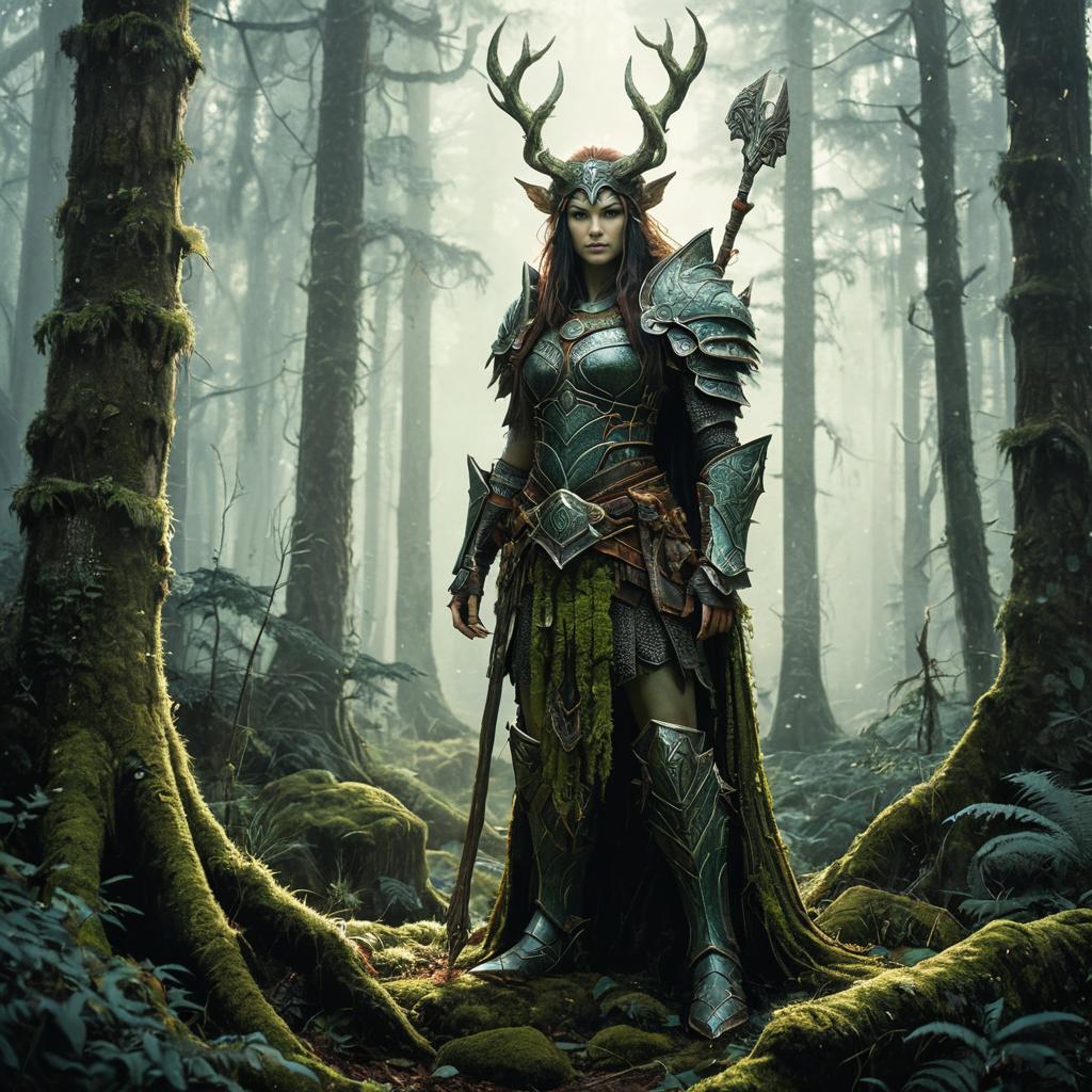 A majestic anthropomorphic harpy with emerald green feathers and large wings, wearing a leather harness and steampunk goggles, stands confidently atop a mist-covered ancient temple surrounded by towering carved stone pillars in a dense mystical forest. The scene is illuminated with cinematic chiaroscuro lighting, showcasing detailed textures and a matte finish in a digital concept art style.