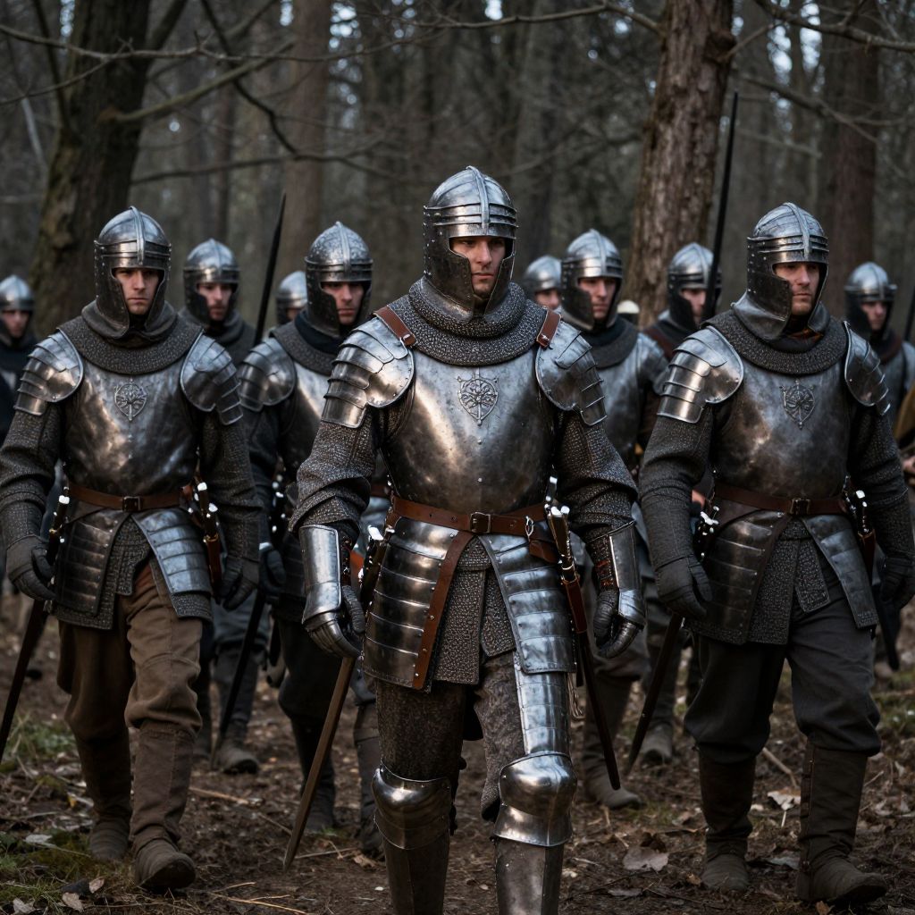 In this vividly detailed scene, a man in armor stands prominently in the foreground, leading a group of soldiers into battle. The armor is intricately designed, with metal plates and leather straps, giving a sense of historical accuracy and readiness for combat. The soldiers, clad in helmets and armor, follow closely behind, their faces obscured by the helmets, adding to the sense of unity and discipline. The forest backdrop, with its tall, leafless trees, creates a somber and foreboding atmosphere, enhanced by the dark natural lighting that casts long shadows and highlights the rugged textures of the armor and the soldiers' faces. The overall composition is dynamic, with the man in armor at the center, flanked by the soldiers, creating a sense of depth and perspective. The image is rich in detail, from the individual strands of hair and the folds in the armor to the intricate patterns on the helmets and the rough texture of the trees. The scene is a powerful depiction of a medieval battle, with a strong emphasis on the physicality and readiness of the soldiers.
