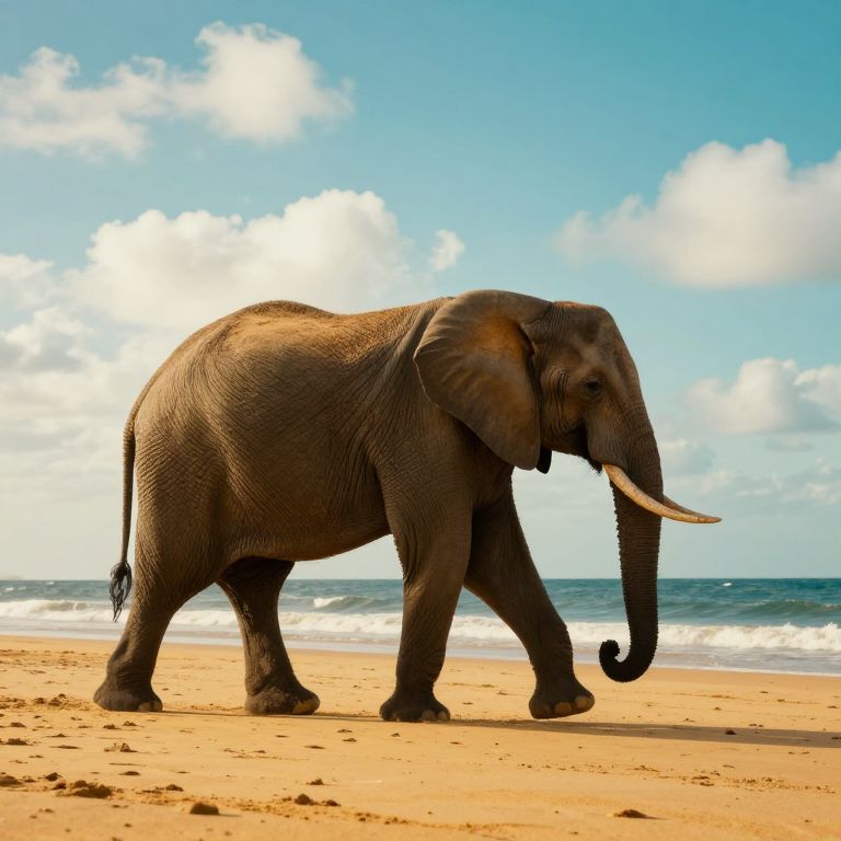 A majestic elephant strides across the golden sands, its form etched against a sky of azure and clouds, embodying the timeless dance between freedom and solitude, while the whispers of the ocean and the warmth of the sun weave a tapestry of serenity and introspection.