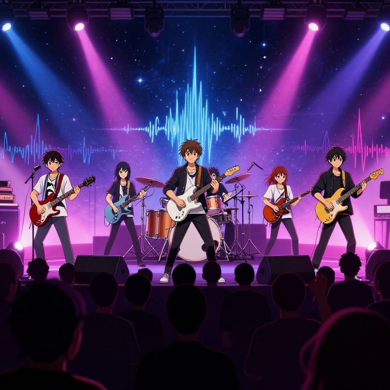 Music anime wallpaper depicting a high-energy concert scene with anime band members performing on stage, vivid spotlights, crowd silhouettes, electric guitars, drums, and synthesizers under a starry sky filled with animated sound waves.