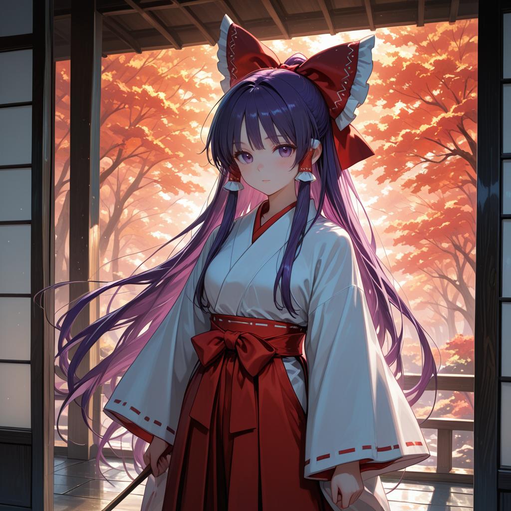 Hakurei reimu (pc-98), touhou, 1girl, purple eyes, purple hair, long hair, very long hair, sidelocks, hair bow, hair tubes, white kimono, white kimono, red bow, long sleeves, wide sleeves, miko, miko, gohei, red hakama, by artist re ghotion, dark_illustrious