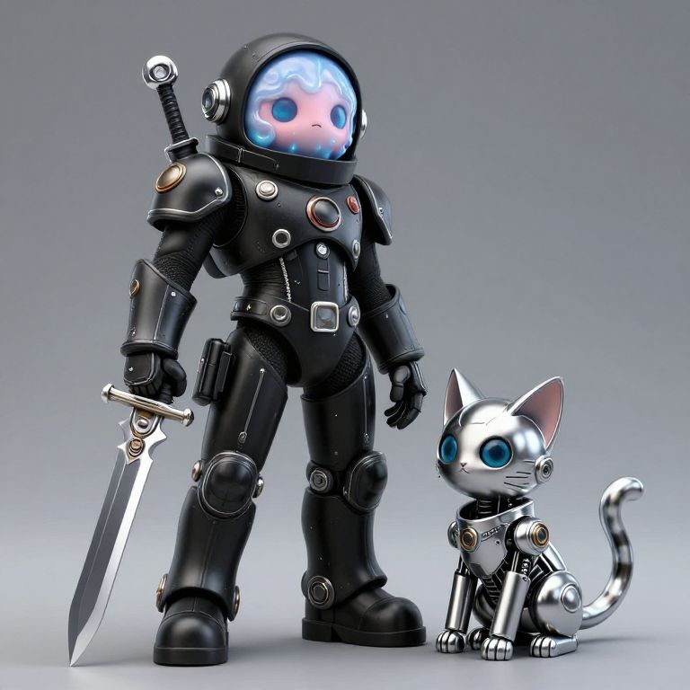 CGI image of a cute, armored astronaut with a glowing blue helmet and a robotic silver cat, standing with a large sword.