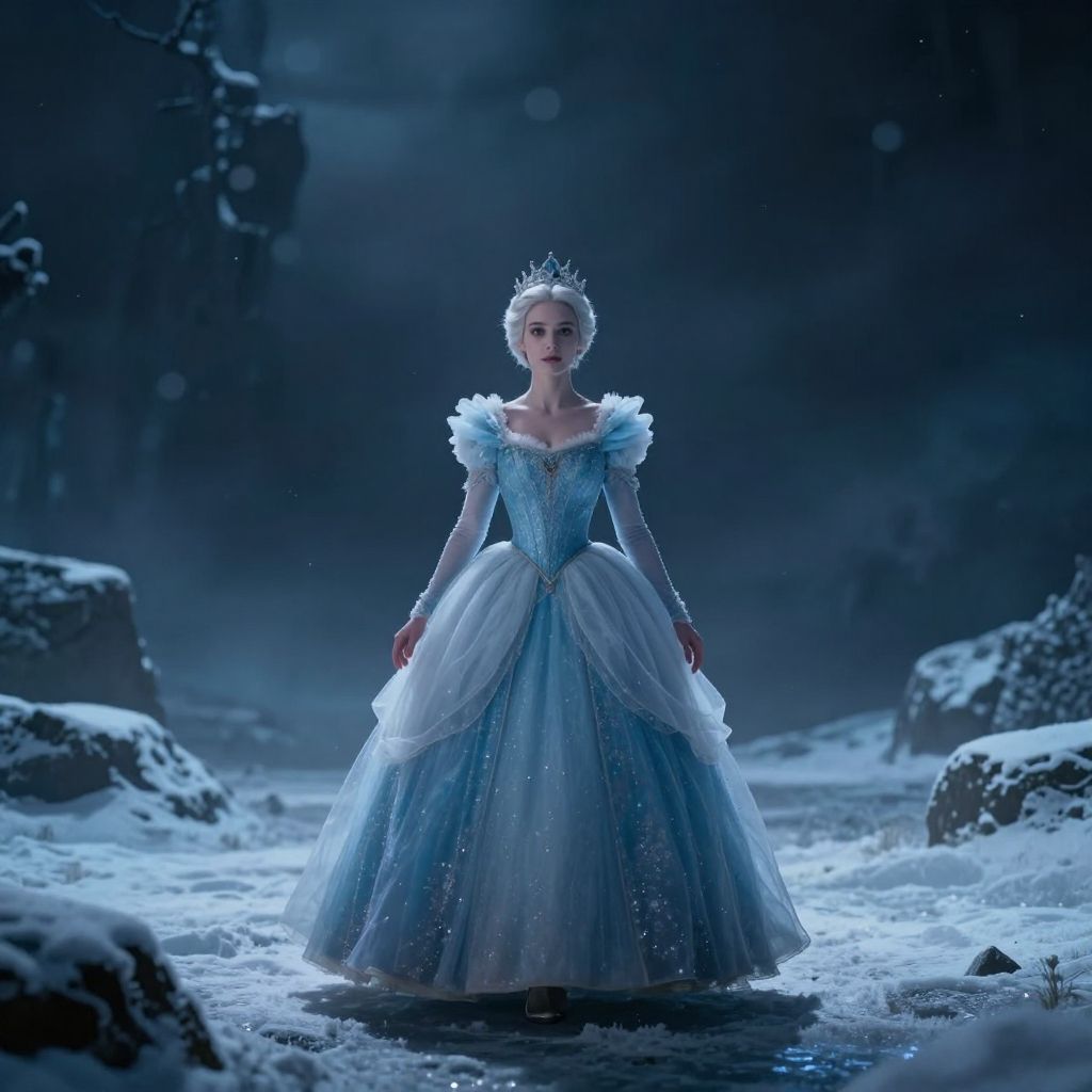 Cinematic film still a snow fairy tales landscape shallow depth of field, vignette, dark magical surrounded sky, highly detailed, high budget Hollywood film, cinemascope, moody, epic, gorgeous