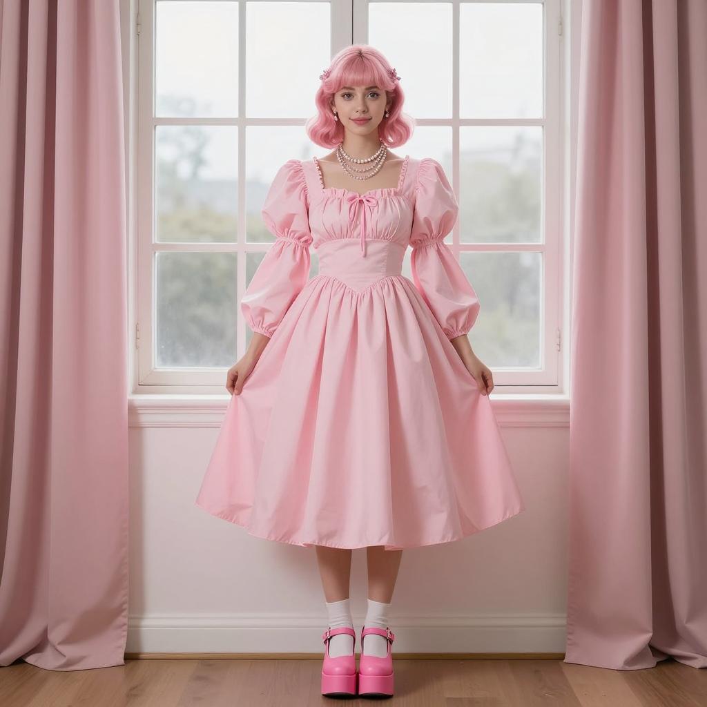 A young woman stands in front of a large window dressed in a vibrant pink, vintage-inspired dress with puffed long sleeves and a flared skirt. Her look is complemented by chunky pink platform shoes, layered necklaces, and a matching pink hairstyle, set against soft pink curtains framing the window.