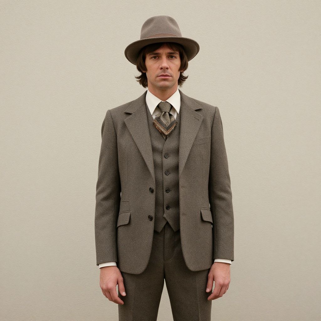 Man Seventies Costume, man in a suit and hat standing in front of a wall