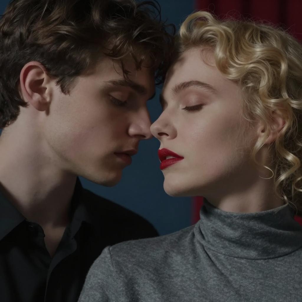 Close-up portrait of a young man with dark hair wearing a black jacket and a young blonde woman with wavy hair. The man is leaning in closely with closed eyes, while the woman, with bold red lipstick and a metallic collar, also has her eyes closed. The background features a dark red gradient, emphasizing the intense and intimate interaction between them.