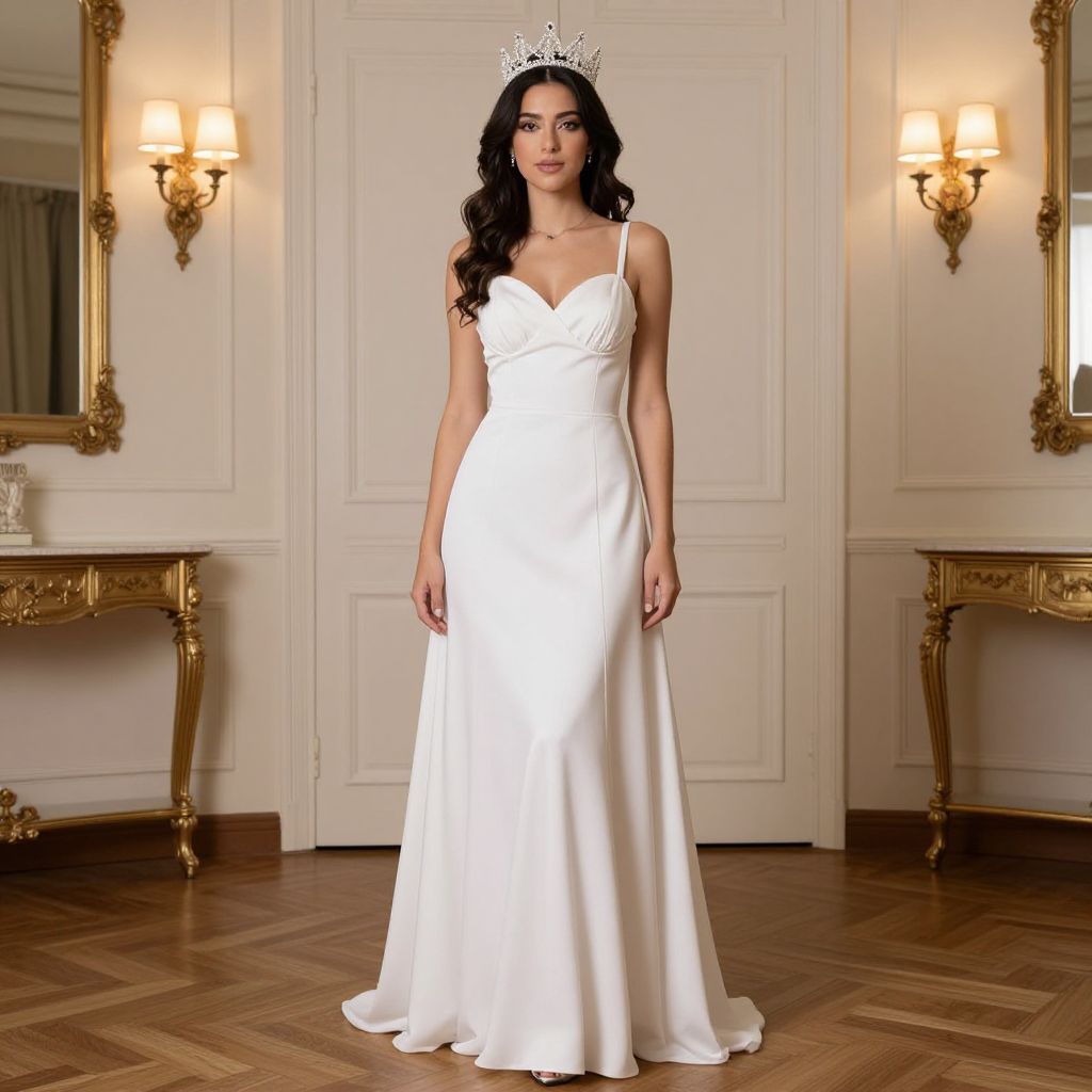 Photograph of a fair-skinned woman with long, wavy black hair, wearing a white, sleeveless, V-neck, satin wedding gown that flares slightly at the bottom. She has a silver tiara on her head. The background features a white paneled wall with two ornate, gold-framed mirrors on either side, each with a wall sconce with a lit lampshade. Two gold, decorative consoles with glass vases sit below the mirrors. The floor is wooden with a herringbone pattern. The woman stands centered, looking directly at the camera with a neutral expression.
