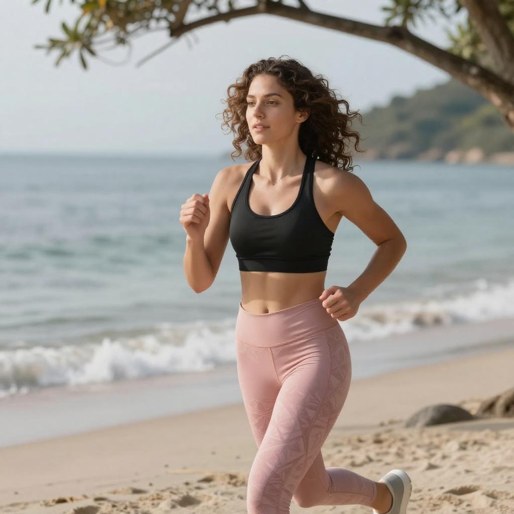 Photograph of a young woman with curly brown hair running on a beach. She wears a black sports bra and pink, patterned leggings. Her right hand is raised, and her left hand is clenched. The background shows a calm sea with gentle waves and a tree branch overhead.