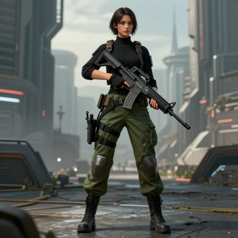 CGI image of a focused, brunette woman with short hair, wearing tactical gear, green cargo pants, and black boots, holding a rifle in a