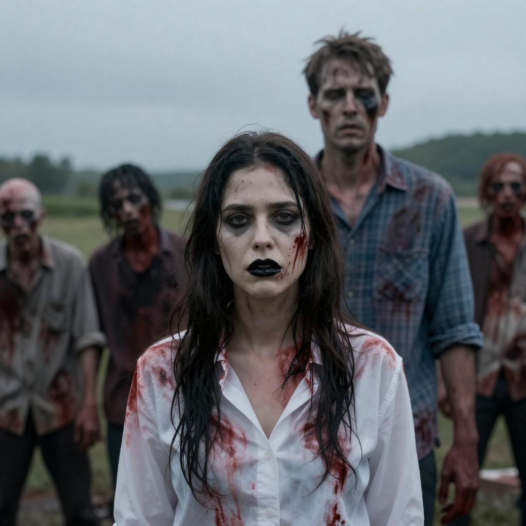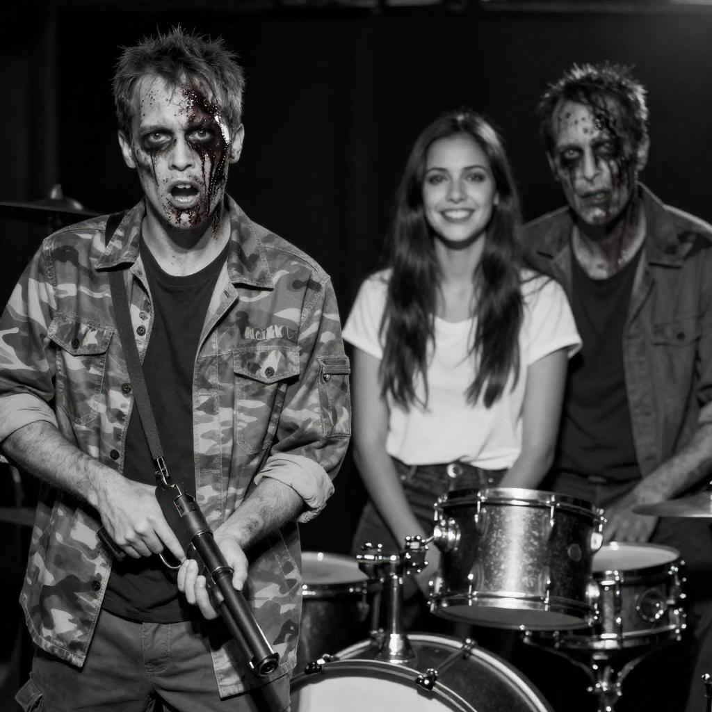 Black-and-white photograph of two scenes. Left: male zombie with blood on face, wearing camouflage shirt, gripping gun, mouth open. Right: female with long hair, smiling, wearing white shirt, next to male zombie, both with blood on faces, behind drum set.