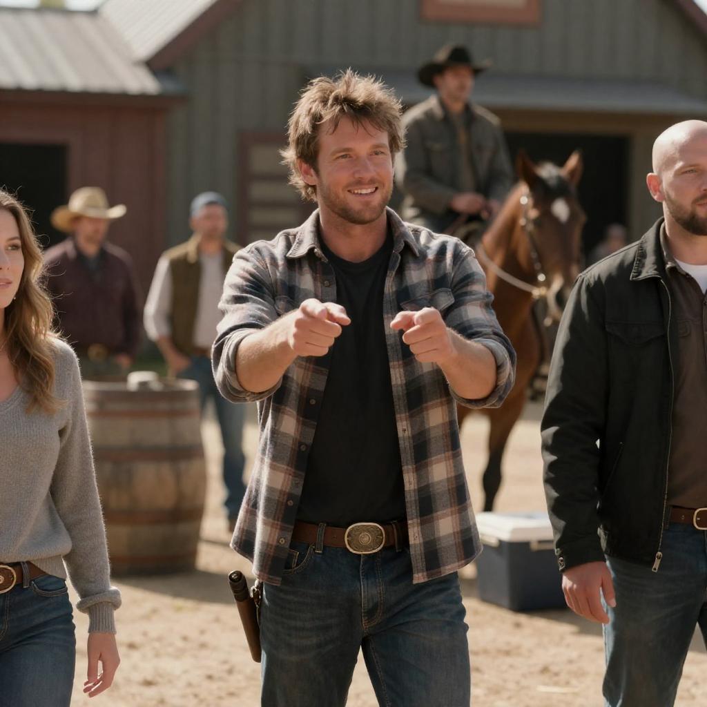Photograph of a night festival. A muscular man with long hair in a sleeveless shirt and jeans rides a red tractor, holding a skeletal flag. A woman with a red and white checkered top and denim shorts raises her arms. Two tractors with American flags. Crowd in the background with hay bales, string lights, and trees. People cheering. The man has a beard, the woman has long hair. The woman is smiling, the man has a serious expression.