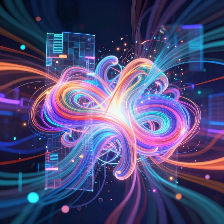 Digital art of vibrant, neon-colored, swirling light trails in pink, blue, and orange, surrounded by glowing lines and geometric grids on a dark blue