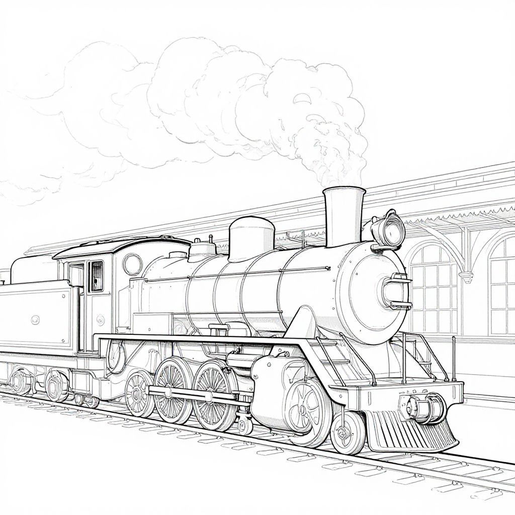 Steam train outline, detailed minimalistic line art of a classic steam locomotive with billowing smoke, vintage railway station background, monochrome style with elegant flowing lines, high contrast on white background, delicate and precise stroke work