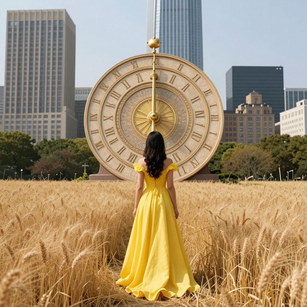 A woman in a radiant yellow gown stands serenely in a golden wheat field, her back adorned by a massive, ornate sundial that defies gravity, seamlessly merging the timeless beauty of nature with the structured elegance of urban skyscrapers in the distance.