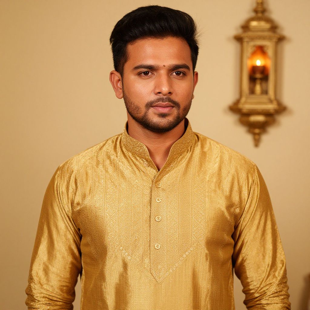 Photograph of a handsome Indian man with dark hair and trimmed beard, wearing a shimmering gold traditional kurta, standing against a beige wall with a