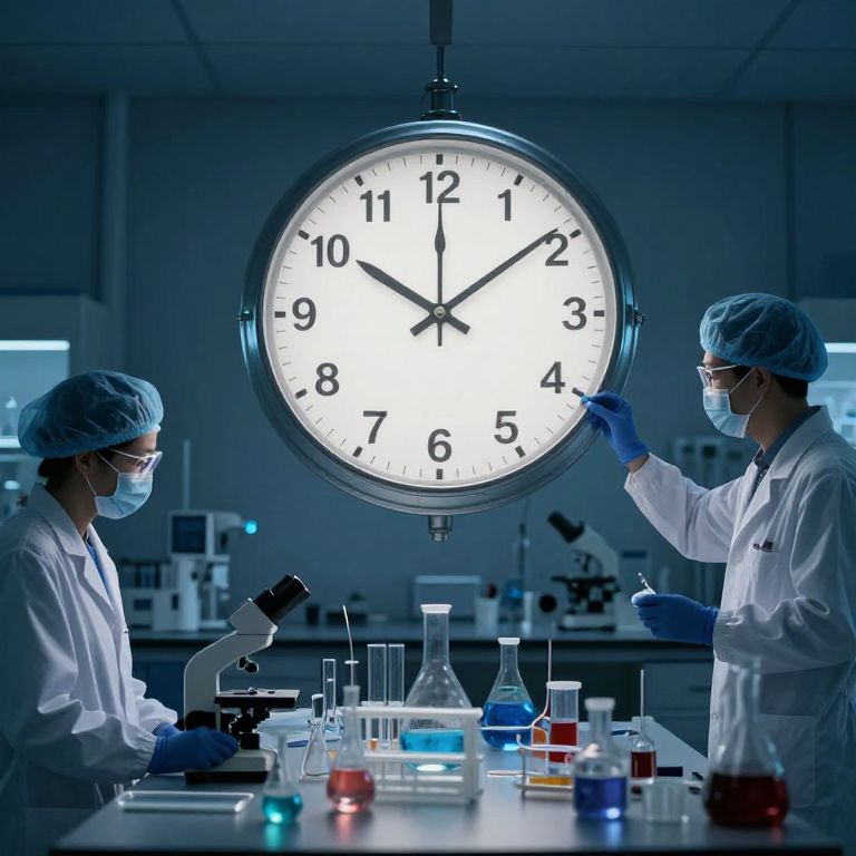 Photograph of a laboratory scene with two scientists in white lab coats, blue hairnets, and face masks, working under bright, blue-tinted lighting. One scientist, on the left, uses a microscope, while the other, on the right, adjusts the large, illuminated clock in the background, which reads 10:10. The table between them holds various lab equipment, including glass flasks with colorful liquids, beakers, and test tubes. The background is slightly blurred, showing lab benches with more equipment. The overall mood is scientific and precise, with a focus on time management and experimentation.
