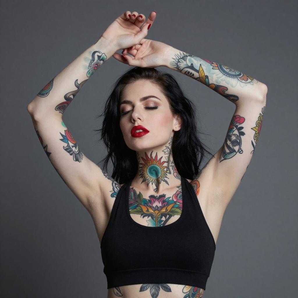 Photograph of a tattooed woman with silver and black hair, black lipstick, and blue earrings. She wears a black bra, checkered pants, and a wrist cuff, with colorful tattoos on her arms and chest. She stands with arms raised, hands in her hair, in a brightly lit, blurred indoor setting.