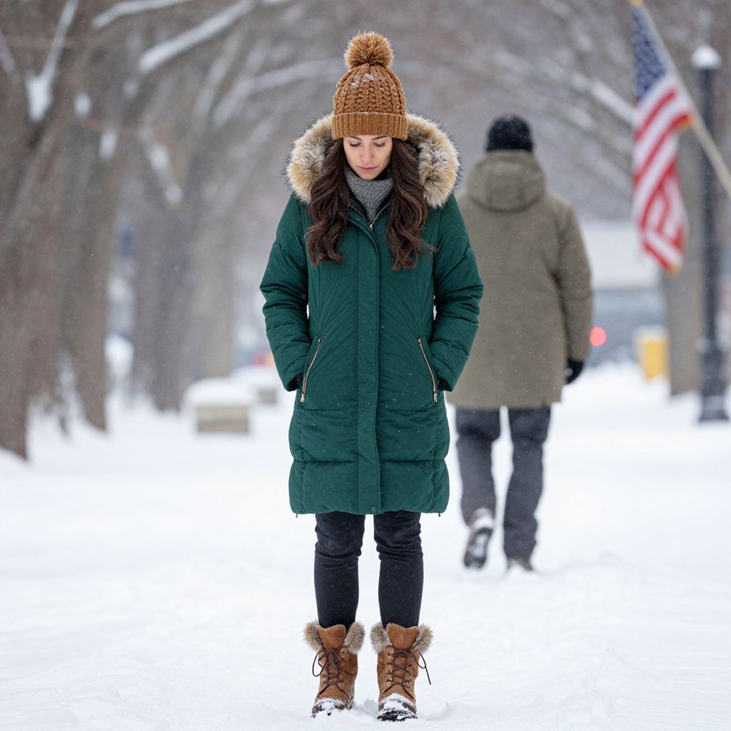 Woman bundled in a green puffer coat with fur-lined hood and brown pom-pom beanie stands amidst falling snow, gazing downward at her brown lace-up boots with fur trim, while a blurred figure walks away in the snowy background framed by trees and an American flag.
