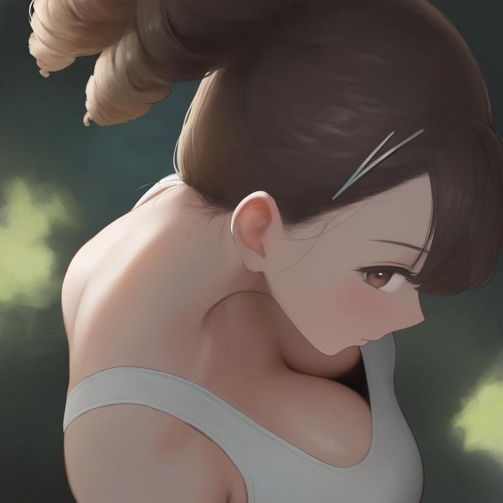 Digital artwork of an anime-style girl with brown hair tied in a curly ponytail, wearing a white tank top. She is depicted from behind in a forest setting, with sunlight filtering through the trees. The girl features a blue hairclip, brown eyes, and is looking sideways back towards the viewer with a subtle expression. The image highlights her cleavage and nape, combining a soft natural environment with detailed character design.