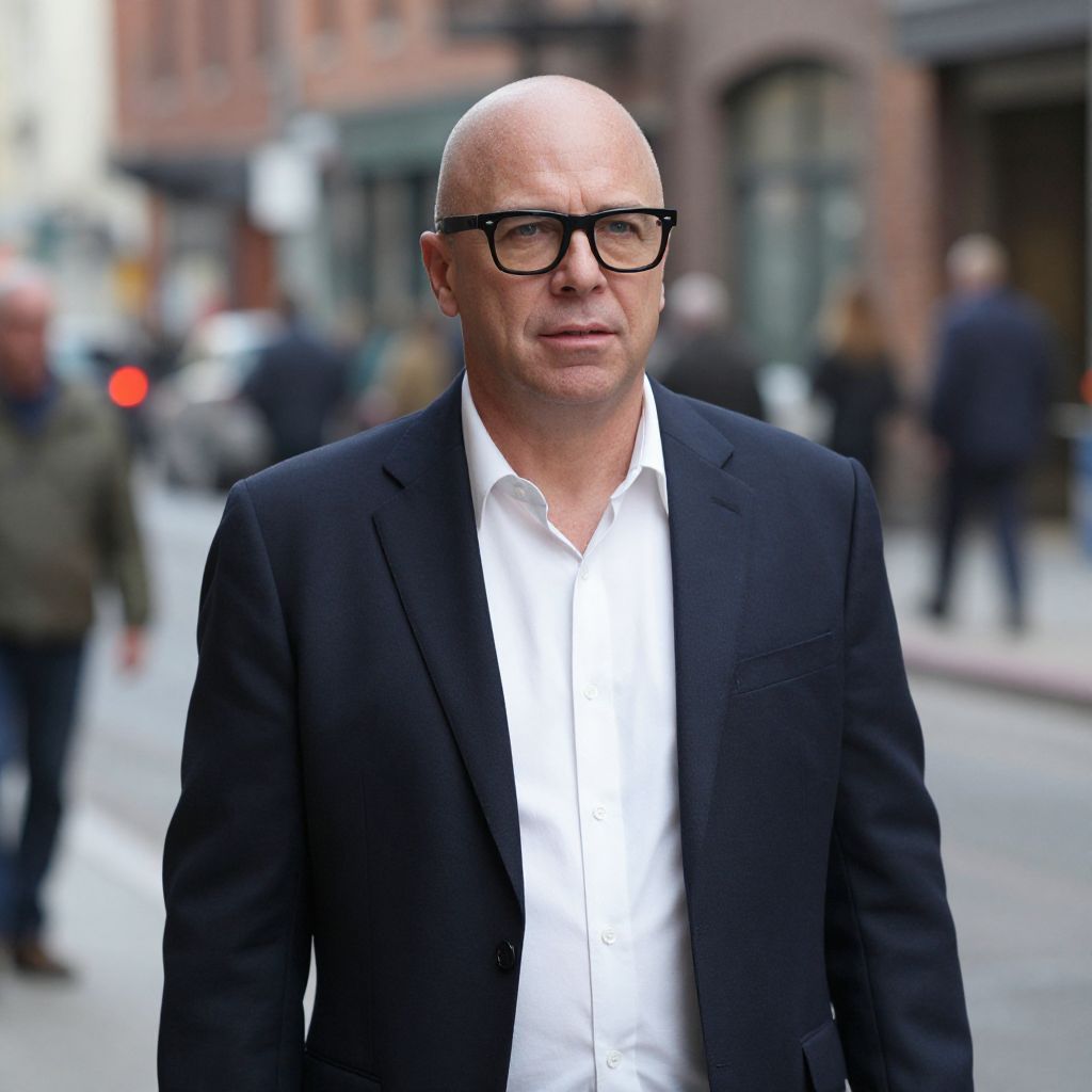 Photograph of a middle-aged bald man with fair skin, wearing black-framed glasses and a black suit over a white dress shirt. He stands on a city street, slightly blurred background shows pedestrians and brick buildings. The man has a serious expression, his suit is well-fitted, and the street is busy with people in the background. The image has a shallow depth of field, focusing on the man while the background is out of focus. The lighting is natural, suggesting an outdoor setting.