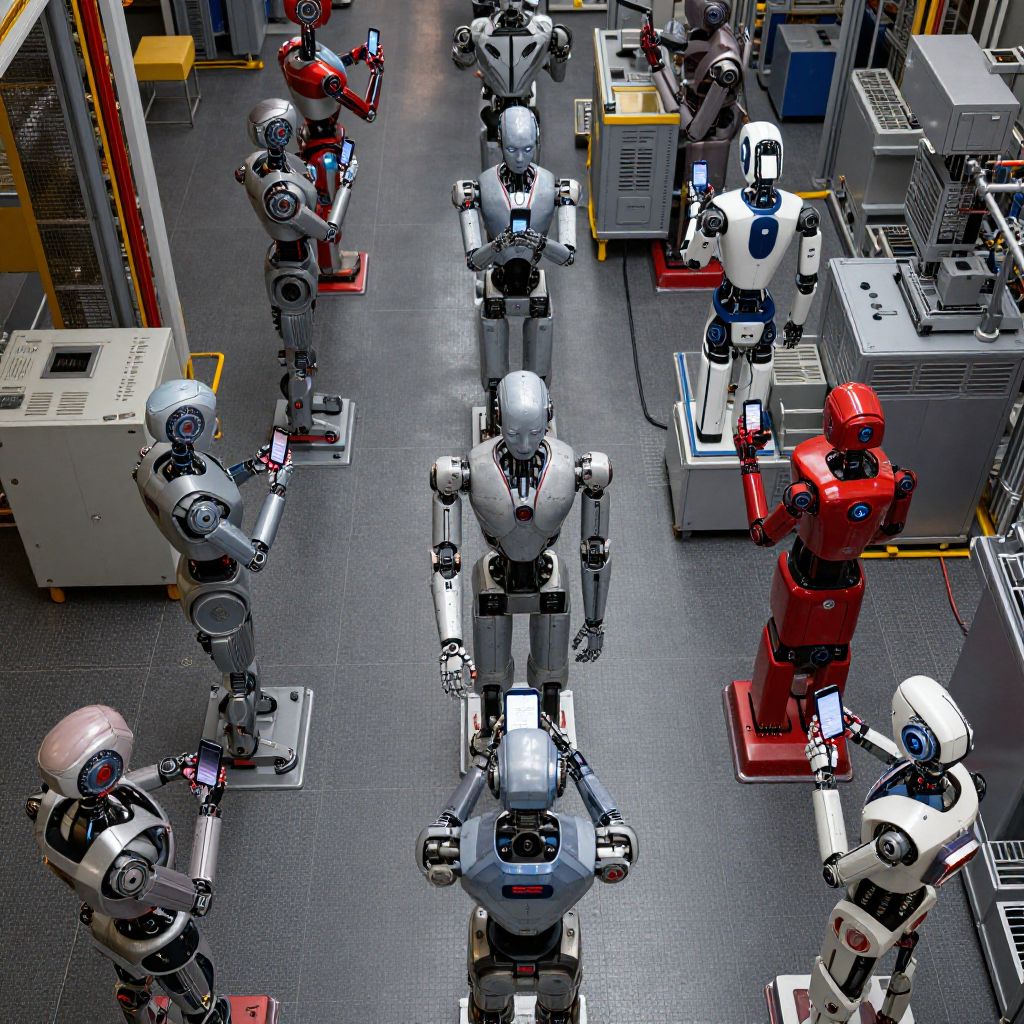 Hdr (High Dynamic Range) Dystopian factory with human like robots in a grid all staring at their mobile phones, Top-Down shot, photographed by annie leibovitz, hyper real, rembrandt lighting, red::2,