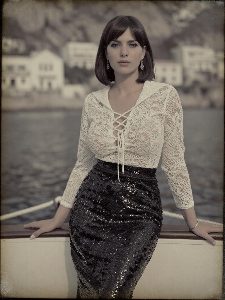 A willowy woman in evening wear, featuring a white lace-up blouse and a black sequined pencil skirt, stands elegantly on a luxury boat in the Amalfi Coast. Visual style: Collodion wet plate. Sexy. Pretty face and beаutiful eyes. Big breasts