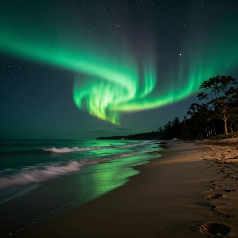 Northern Lights illuminate the serene coastline of Sango Sands, casting vibrant green hues over the tranquil waves and silhouetted trees under a starry night sky.
