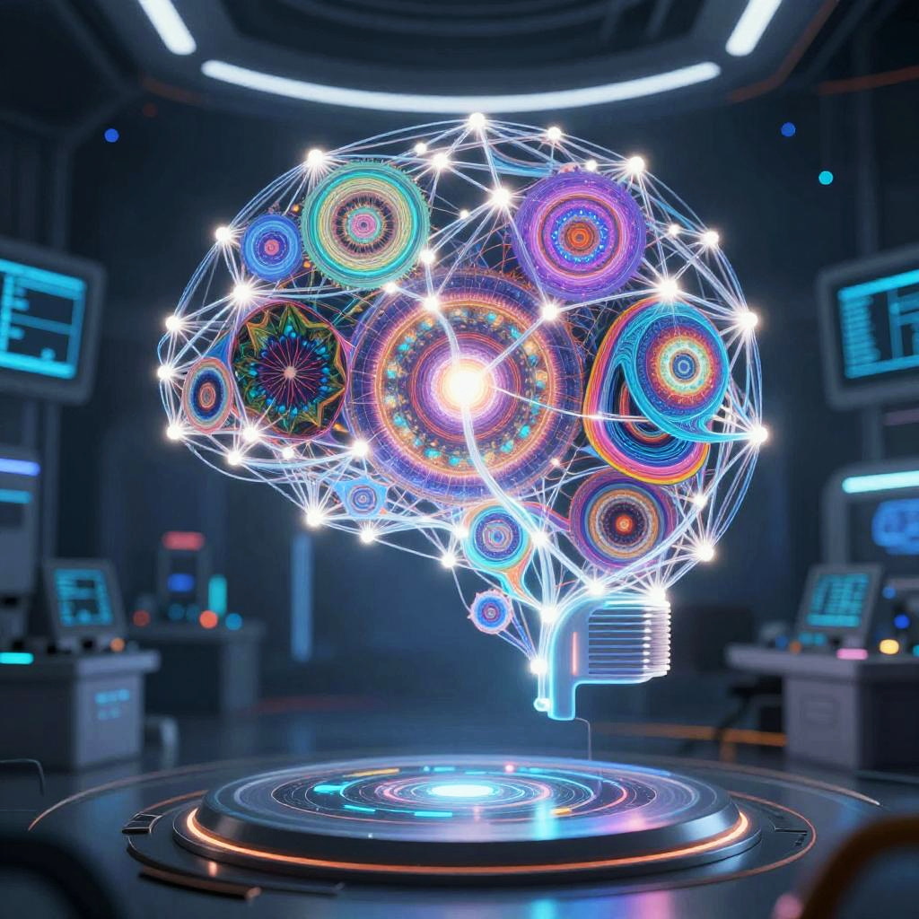 A CGI digital artwork depicting a glowing, geometric brain composed of interconnected, colorful, circular patterns in hues of blue, purple, red, and green. The brain floats above a futuristic, dark blue, circular platform with concentric rings of light. In the background, there are blurred, high-tech control panels with glowing blue screens. The overall scene exudes a high-tech, sci-fi atmosphere with a focus on digital connectivity and neural networks. Bright white lights accentuate the intricate wireframe structure of the brain.