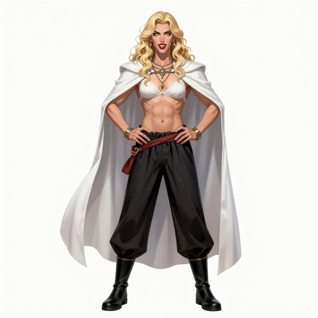Masterpiece, best quality, high quality, highres, straight-on, looking at viewer, upper body, solo, ARTSTYLE_AlexRoss_ComicArt_ownwaifu, www.ownwaifu.com, lo, simple background, black hair, 1boy, white background, standing, full body, male focus, boots, cape, sash, bodysuit, hands on hips, white cape, vampirelong hair, blonde hair, breasts, lips, makeup, yellow eyes, lipstick, curly hair, wavy hair, red lips, medium breasts, narrow waist, pale skin, jewelry, necklace, bracelet, midriff, navel, harem outfit, harem pants, cleavage, see-through, dress, arabian clothes, teeth, fangs, sharp teeth, photorealistic, realistic, open mouth
