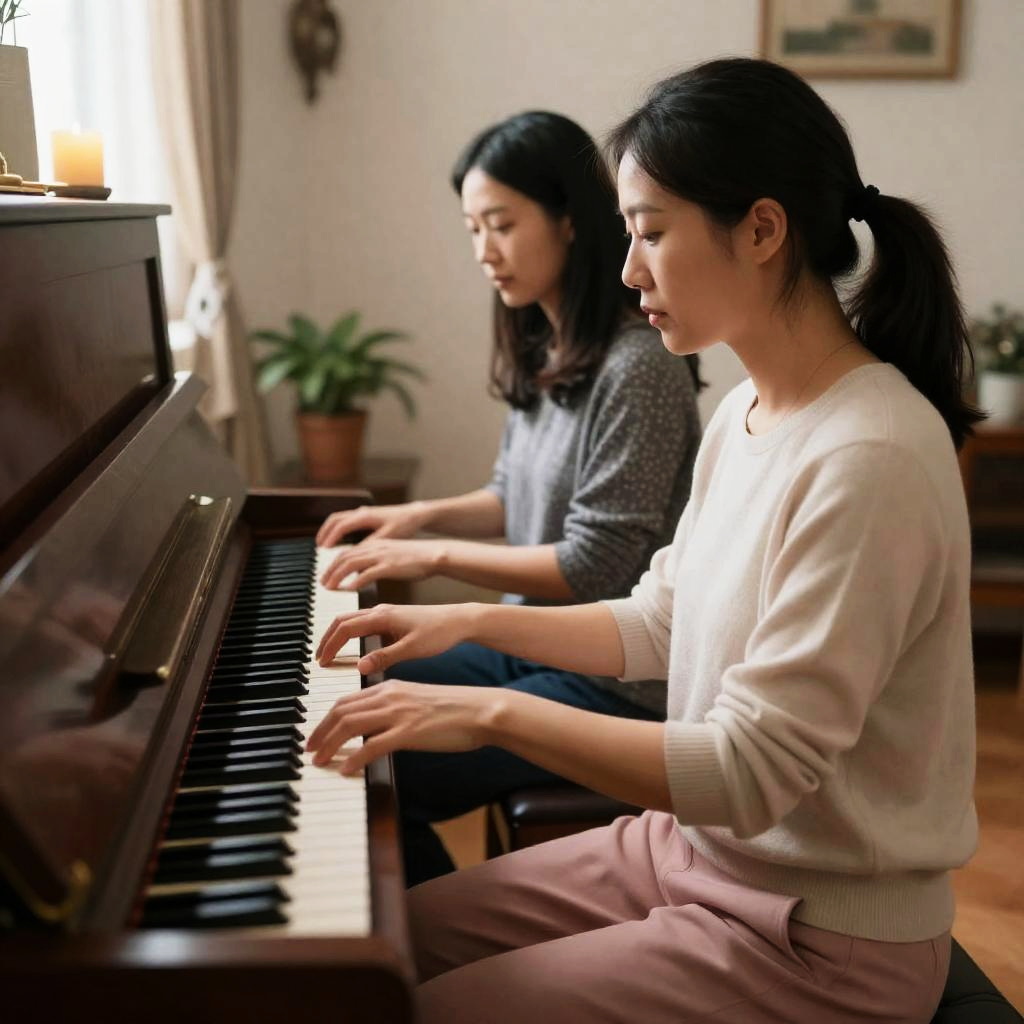 Black-and-white photograph of two women facing each other outdoors. Left woman has dark hair in a headband, black sweater. Right woman has short dark hair, dark sweater, light-colored skirt. Dense forest background with trees and a wooden fence. Both women look at each other, slightly smiling. Additional person and dog in background.