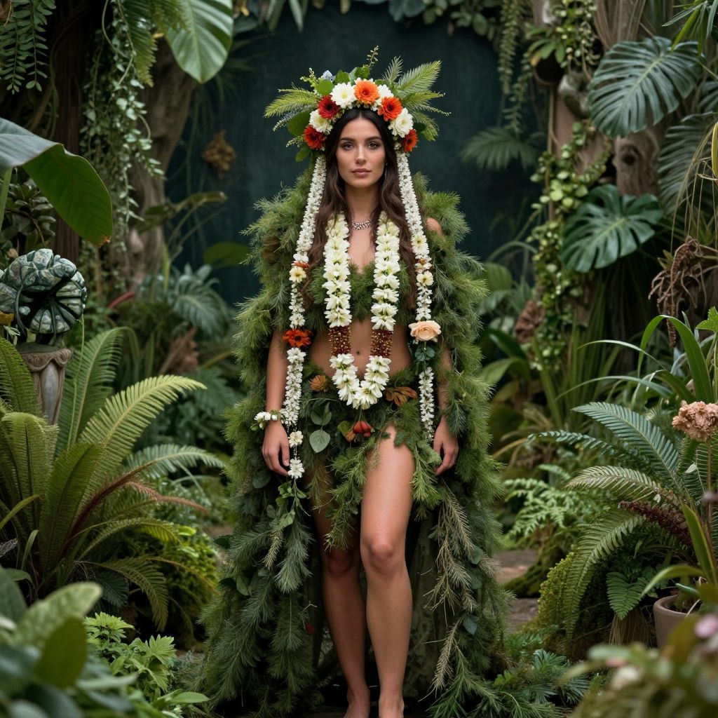 A woman adorned with floral garlands and draped in greenery stands amidst a lush, fantastical garden, evoking themes of nature, mythology, and ritual.