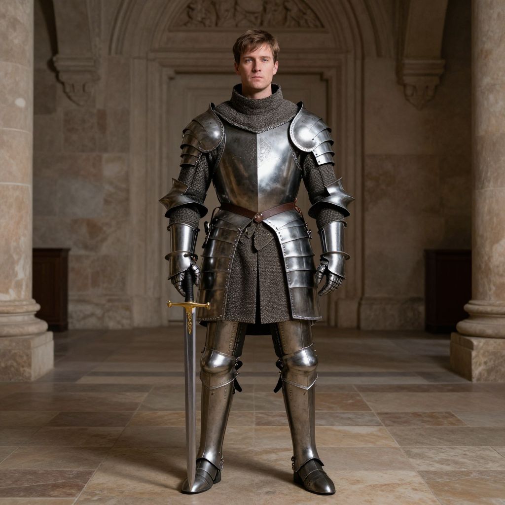Photograph of a white male knight in polished silver armor, holding a sword, standing in a medieval stone hallway.