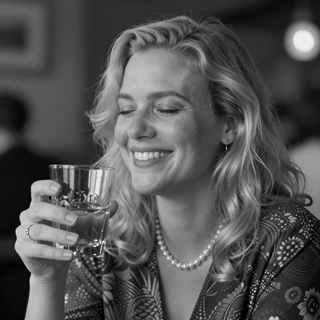 Black-and-white portrait of a happy blonde woman with wavy shoulder-length hair, wearing a dark patterned dress and a pearl necklace. She holds a glass with a clear liquid in her right hand, eyes closed and head tilted to the right, set against a softly blurred indoor background.