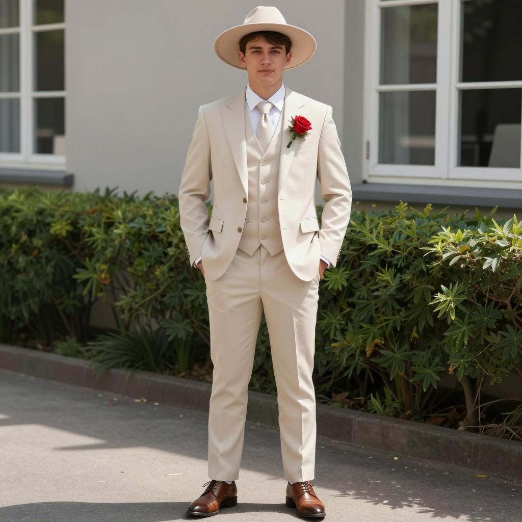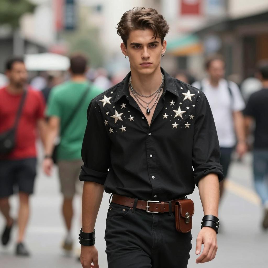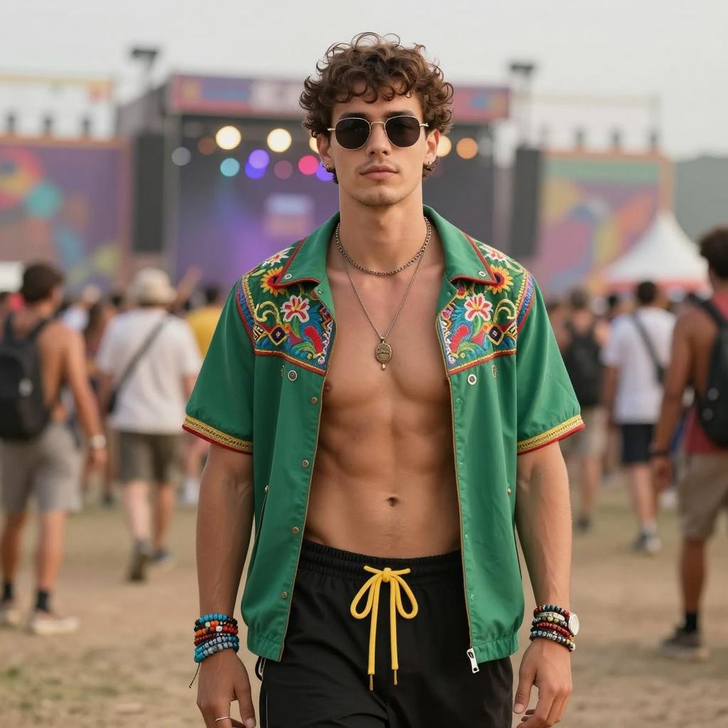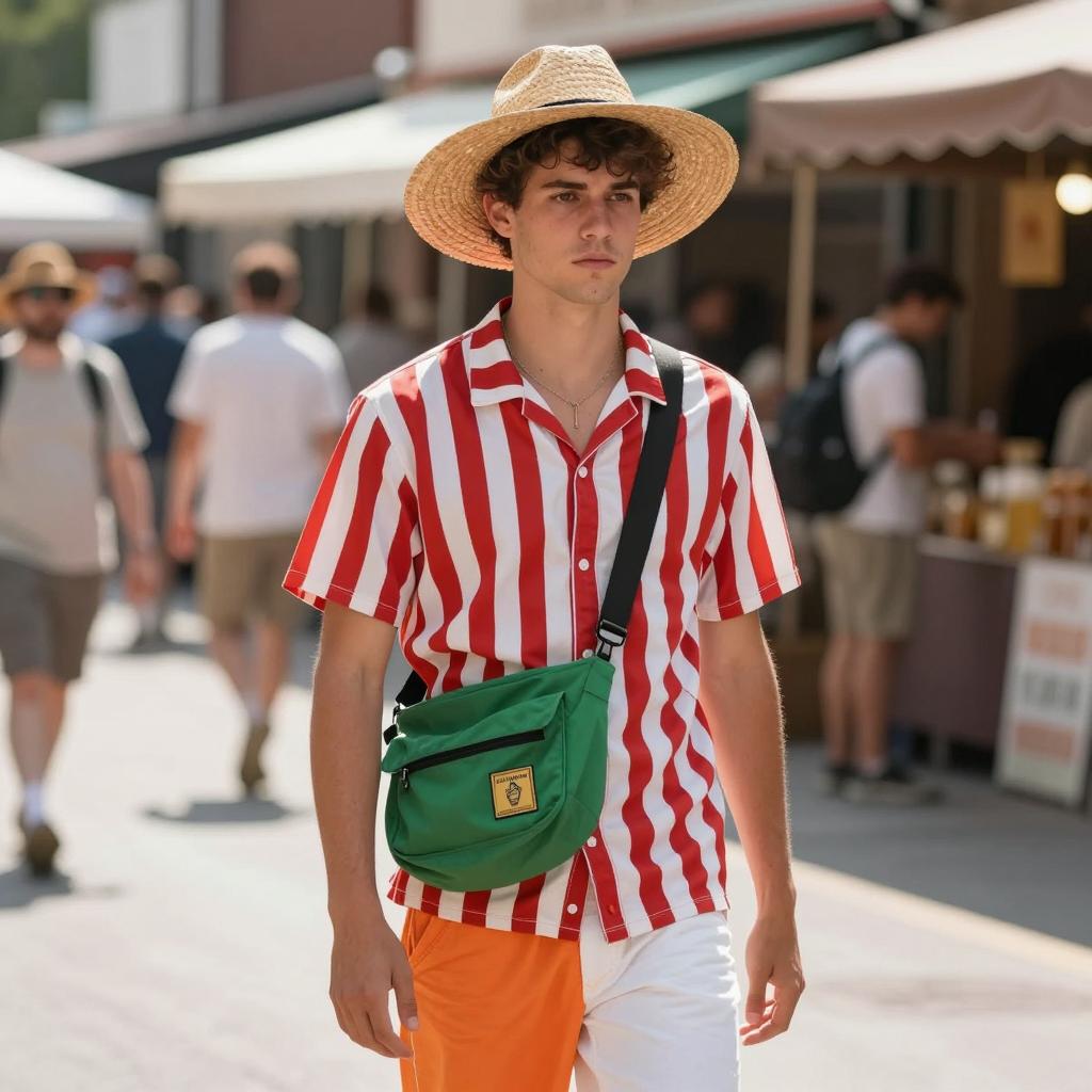 Beer fest costume, photorealistic, young man, standing, daytime, street, straw hat, striped shirt, red and white, green messenger bag, orange and white pants, serious expression, sunlight, blurred background, outdoor market, realistic ures, soft shadows, summer, casual attire, slight bokeh, modern photography style